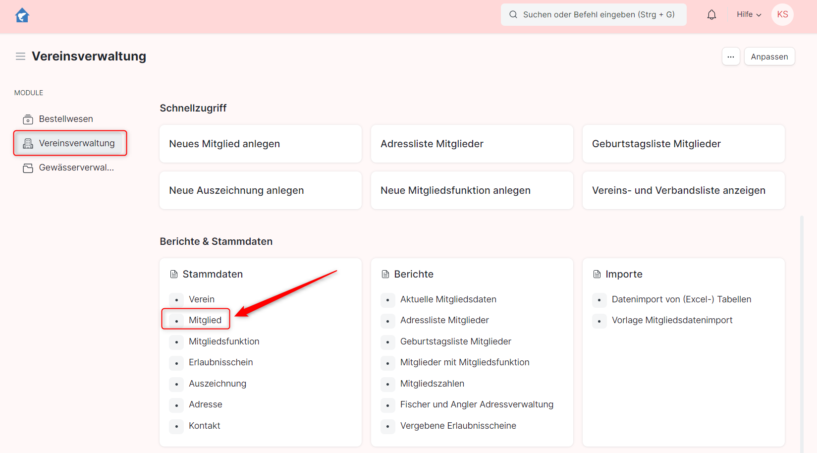 Zum Löschen eines Mitgliedes sucht man zunächst das entsprechende Mitglied aus der Listenansicht "Mitglied" heraus. Die ist unter Vereinsverwaltung > Stammdaten > Mitglied zu finden: