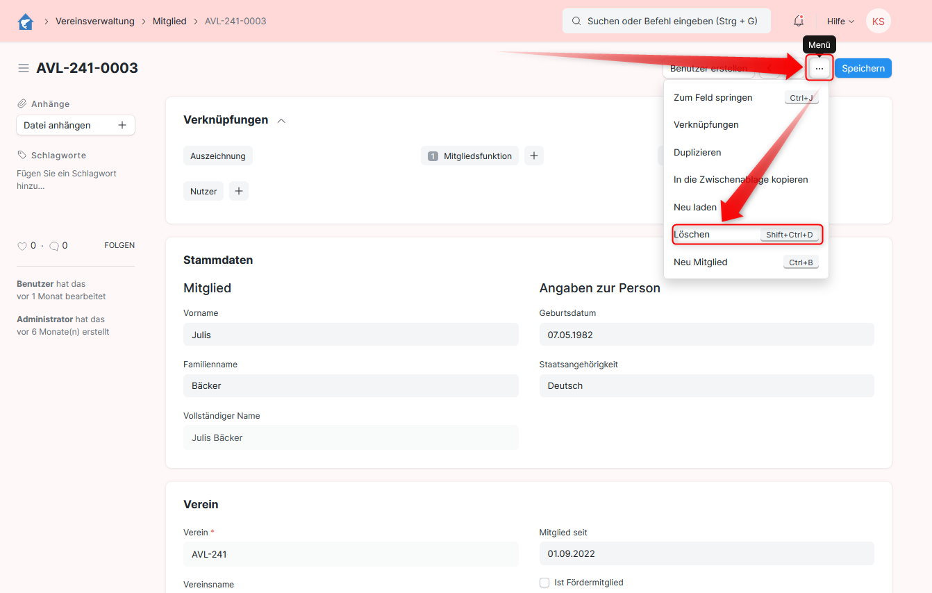Das Mitglied kann man nun entweder über die Tastenkombination [Shift]+[Strg]+[D] löschen oder man geht über das Menü (die drei schwarzen Punkte) und klickt dort auf "Löschen"