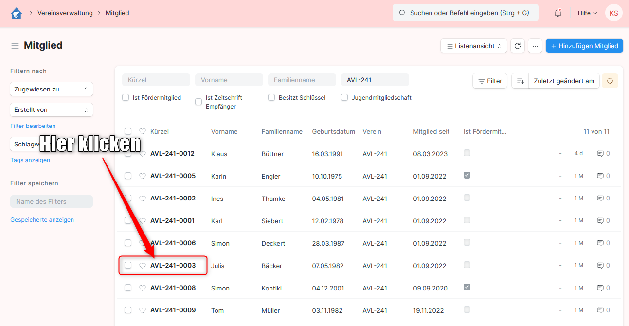Hat man das zu löschende Mitgleid gefunden (in diesem Beispiel soll der Julis Bäcker gelöscht werden), klickt man zunächst auf die Mitgliedsnummer (in der Spalte "Kürzel". So gelangt man in die Einzelansicht des Mitgliedes.