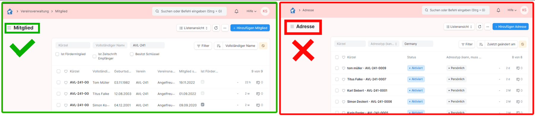 2.: Adresse ist nicht gleich Mitglied! Das Löschen einer Adresse führt nicht zum Löschen des Mitgliedes. Daher sollte darauf geachtet werden, dass man sich auch in der Liste "Mitglied" und nicht "Adresse" befindet, um das zu löschende Mitglied zu suchen.